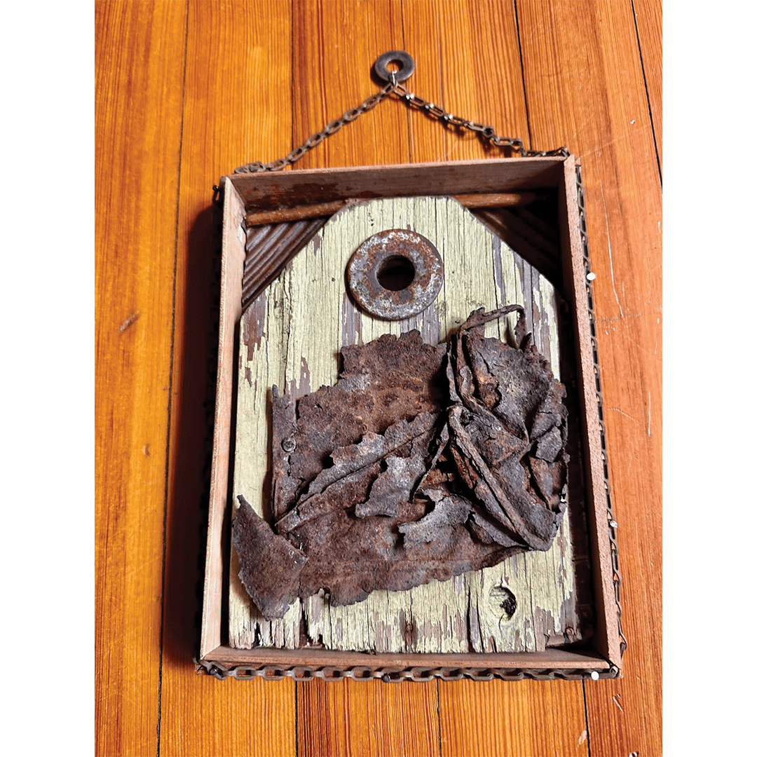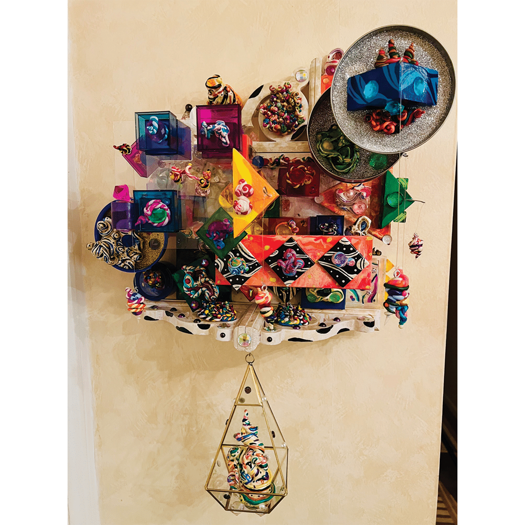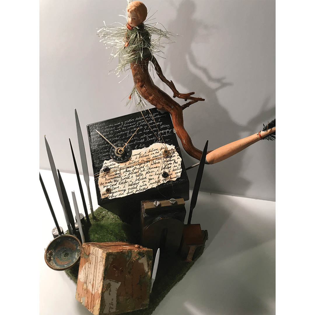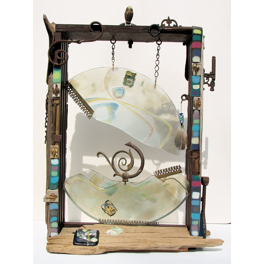 The Huntington Arts Council invited artists to participate in Assemblage, a juried show. Artists were encouraged to submit artwork created on a defined base with 3D elements coming out of or from it. The use of found objects was welcomed but not required. Work could be free standing or wall hanging.