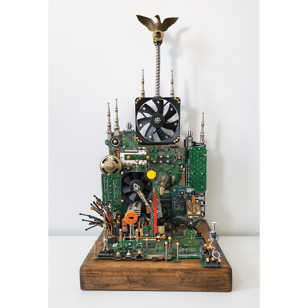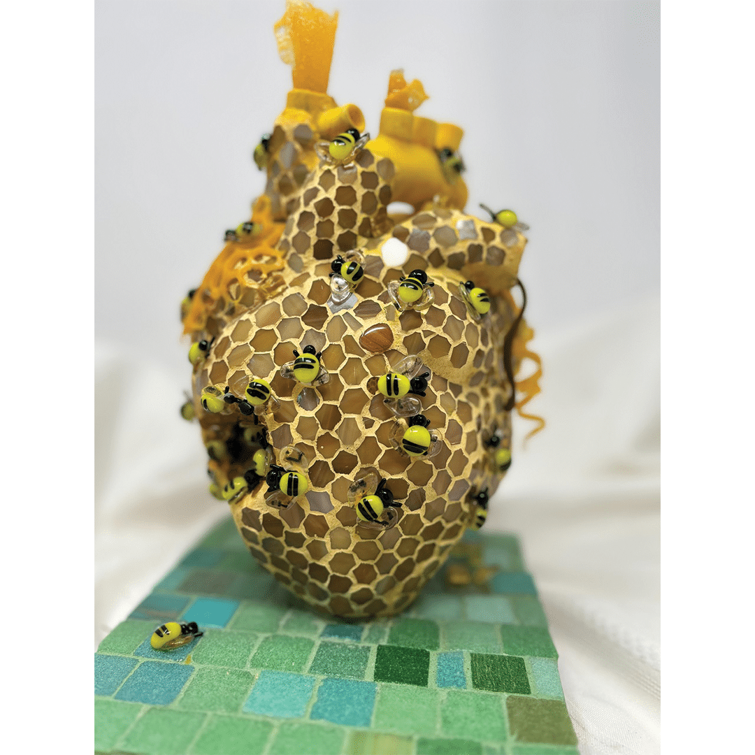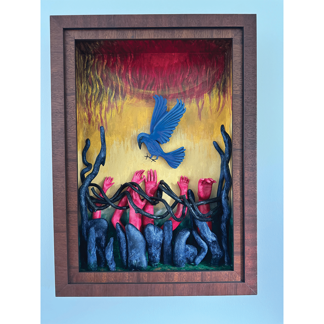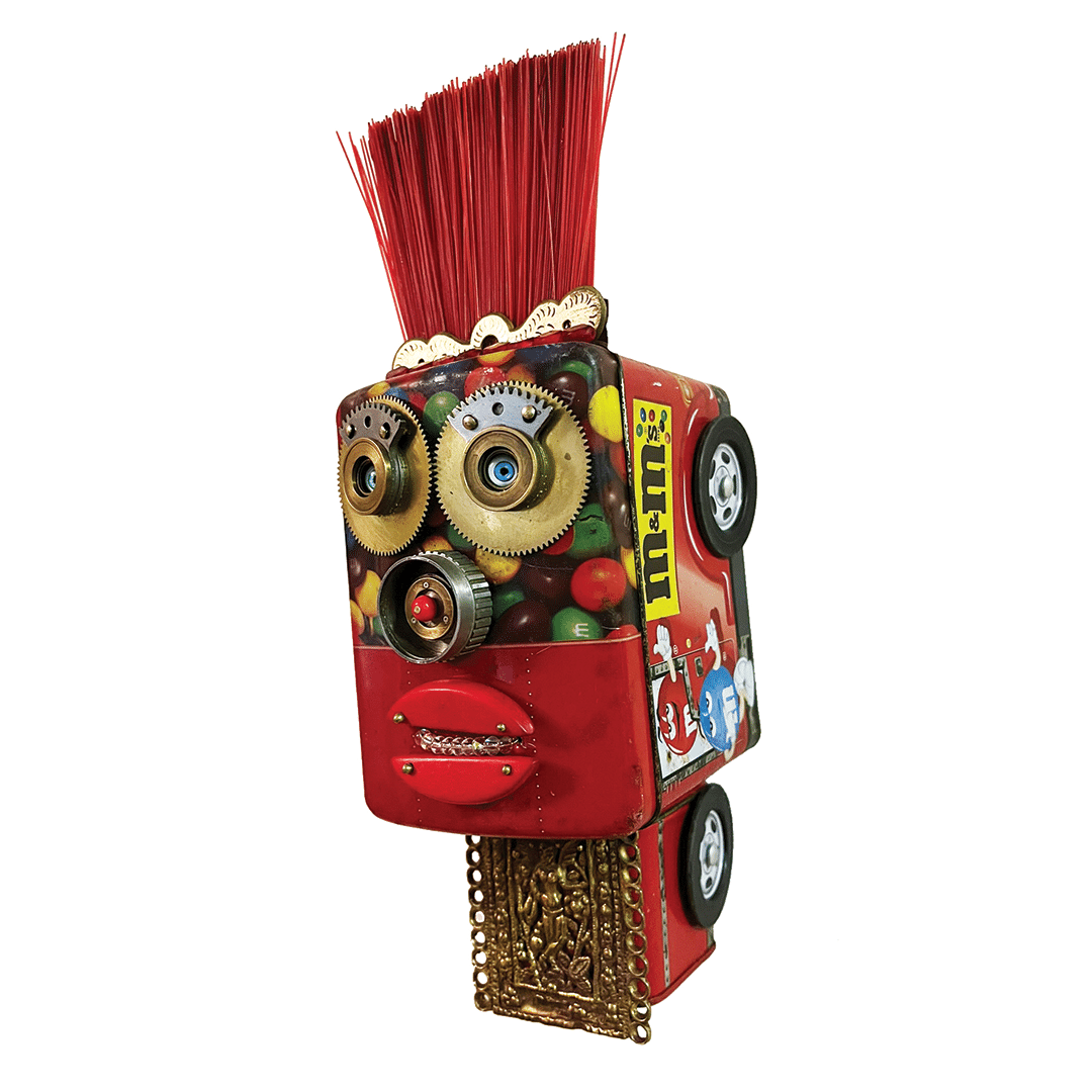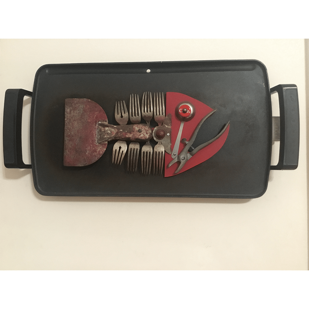 The Huntington Arts Council invited artists to participate in Assemblage, a juried show. Artists were encouraged to submit artwork created on a defined base with 3D elements coming out of or from it. The use of found objects was welcomed but not required. Work could be free standing or wall hanging.