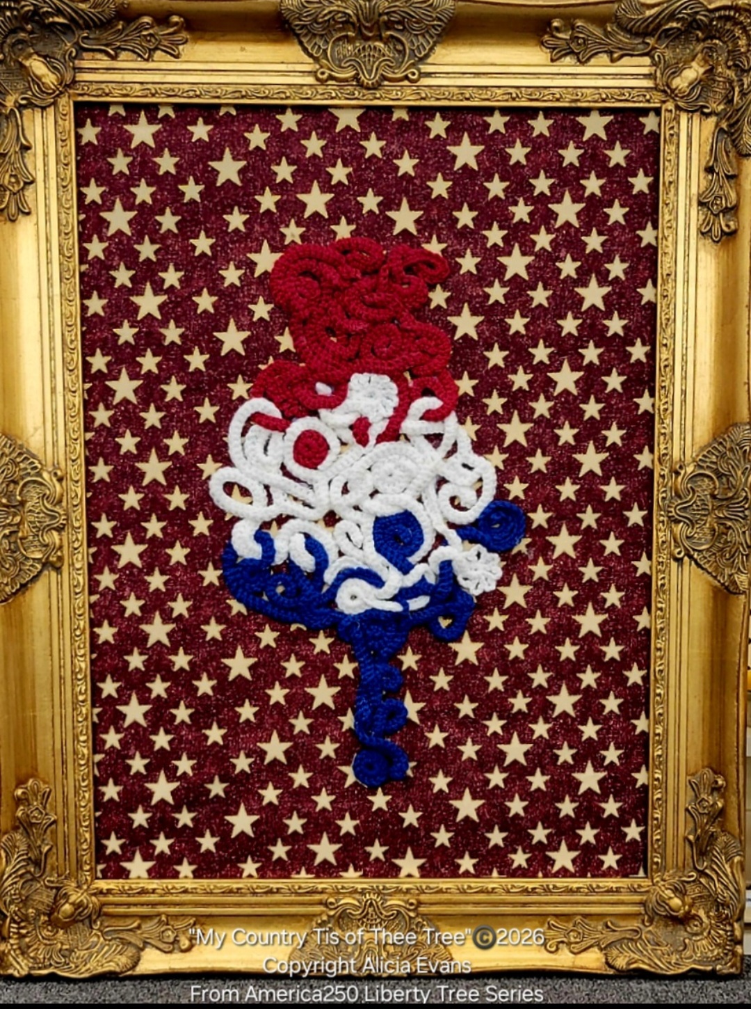 Award-winning fiber artist Alicia Evans presents America250: The Liberty Tree Series Collection, a solo exhibition that weaves together fiber art, storytelling, and historical reflection through the enduring symbolism of red, white, and blue crocheted trees. This body of work honors America’s 250th anniversary by exploring themes of freedom, resilience, and shared national memory.
