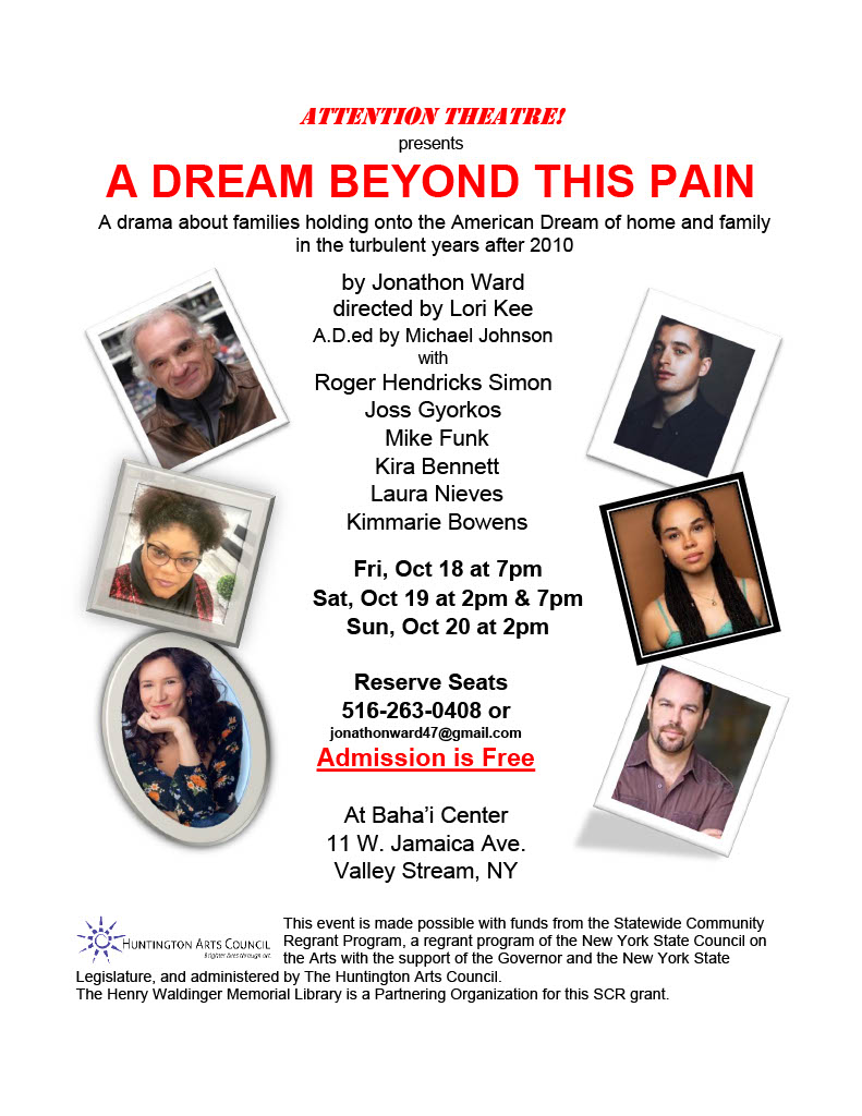 ATTENTION THEATRE! presents the premiere performances of A Dream Beyond This Pain, a drama about the Freedman and Mathews families on Long Island holding on to their American Dream through the tumultuous years since 2010. In the Freedman and Mathews families, pain and pain relief are so wound up together, through the use of medicinal and recreational drugs, that it’s hard for them to know how to find peace within their homes, their families, and themselves. Can they recover from their struggles and hold on to their dreams?