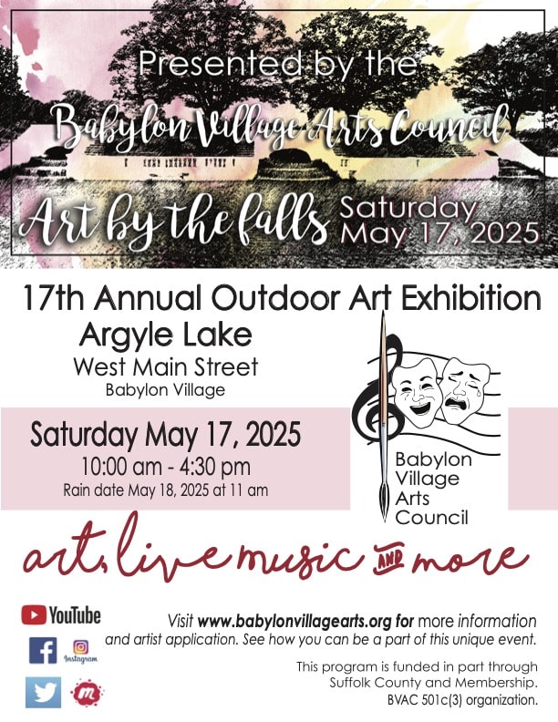Babylon Village Arts Council will hold its 17th annual outdoor art exhibit ‘Art by the Falls’ on Saturday, May 17 at Argyle Park. The exhibit local Long Island artists and will begin at 10 am. This free event is open to the pubic.Rain date is Sunday, May 18 at 12.