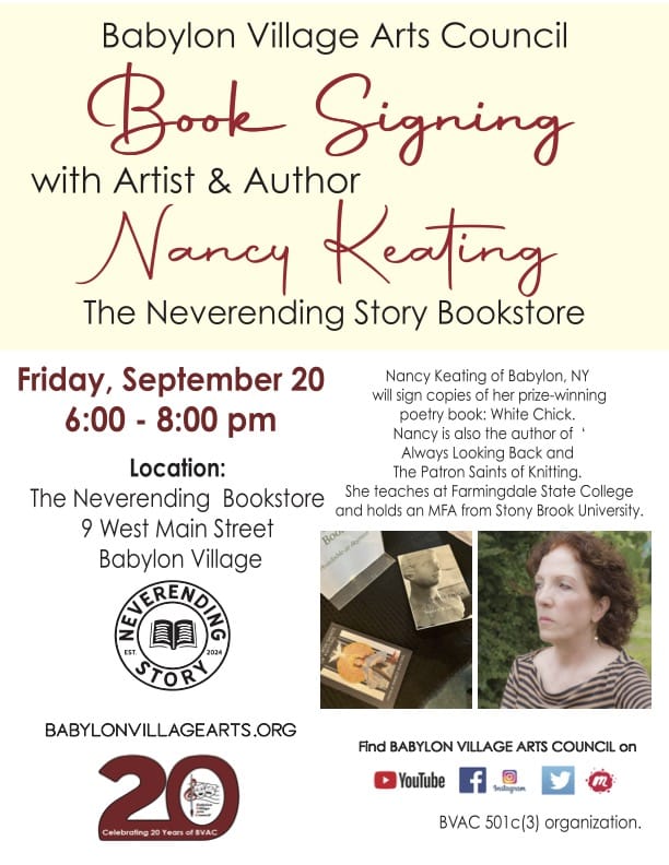 Babylon Village Arts Council is presenting a book signing with author and poet Nancy Keating on Friday, September 20 at the Neverending Book Store from 6-8. Meet Nancy Keating who will sign copies of her prize-winning book “White Chick”.