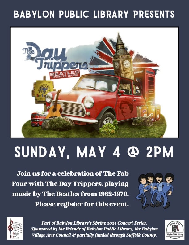 Join the Babylon Village Arts Council and the Friends of the Babylon Library on Sunday, May 4 at 2 pm to celebrate The FAB FOUR with the Day Trippers, playing music by the Beatles from 1962-1970. Please register for this event at the Babylon Library. This event is partially funded through the Friends of the Libabry, and Suffolk County.