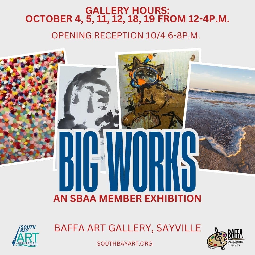The BAFFA Art Gallery welcomes back the South Bay Art Association with their second BIG Works exhibit in October. Big Works: a SBAA Member Exhibition can be viewed on October 4, 5, 11, 12, 18, and 19 from Noon to 4:00 PM, with an opening reception on October 4 from 6:00 to 8:00 PM.