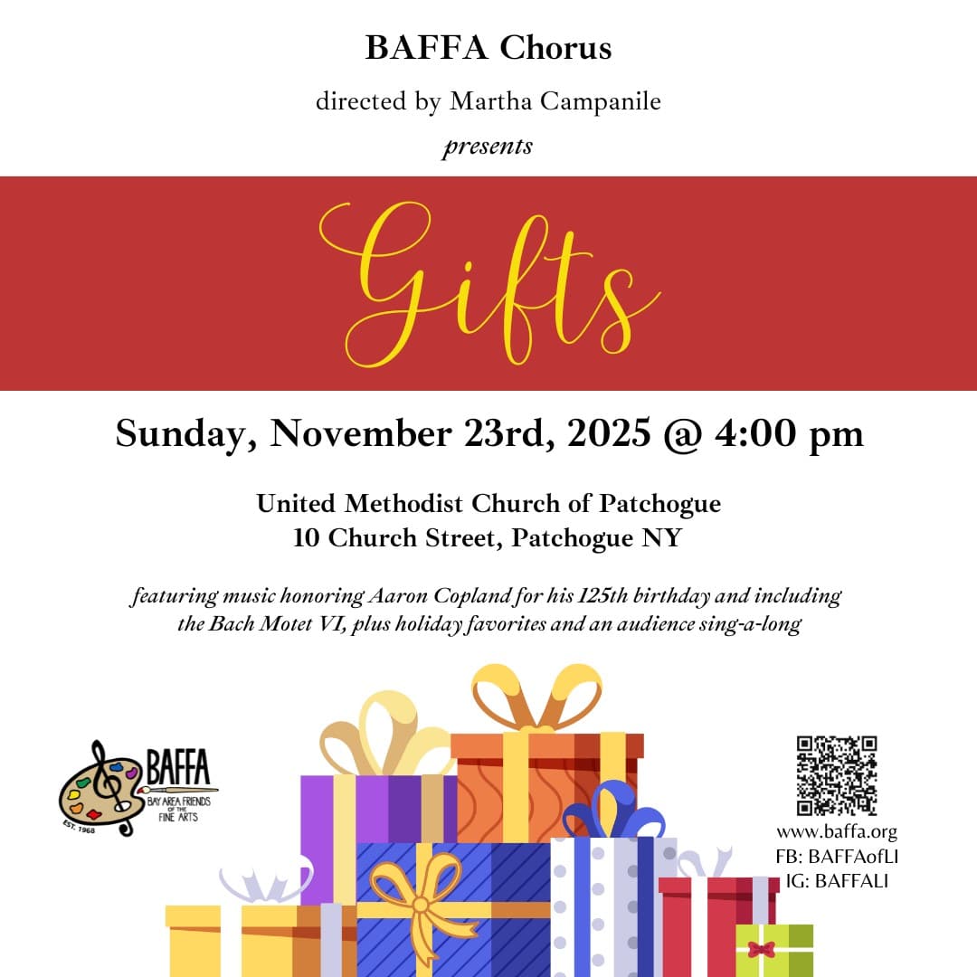 The Bay Area Chorus of BAFFA will perform on Sunday, November 23rd, at the United Methodist Church of Patchogue. The chorus presents Gifts of music to the audience, including pieces by Bach, Copland, and seasonal favorites. The concert will conclude with an audience sing-along of favorite holiday songs. The concert begins at 4:00 PM and is free; donations are welcome.
