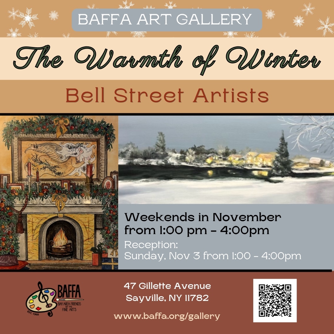 Please join us at the BAFFA Art Gallery as the Bell Street Artists return to Sayville with their newest exhibit. The Warmth of Winter is a mixed-media exhibit by this talented group of nine artists.
