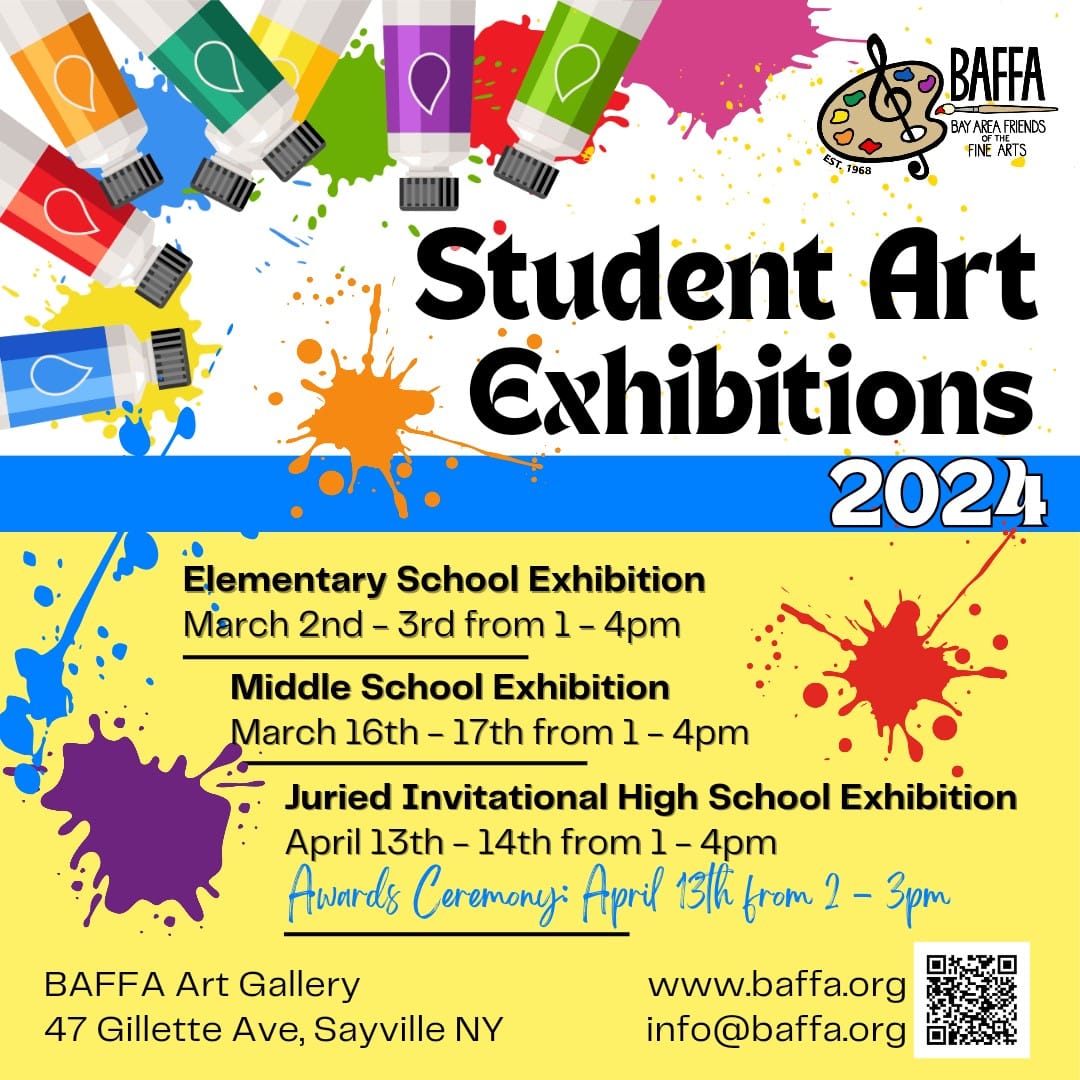 Every Spring BAFFA showcases the artwork of the local area’s elementary, middle, and high schools. This year the exhibits begin on March 2 and 3 with artwork by Sayville and Bayport-Blue Point elementary schools. Artwork by Sayville and Bayport-Blue Point Middle School students will be featured on March 16 and 17. Both exhibits can be seen at the BAFFA Art Gallery from 1 to 4 PM on those weekends. The exhibits are open to the public and are free. We hope the young artists’ moms and dads, siblings, uncles and aunts, and grandparents will stop by the Gallery to view the children’s artwork.