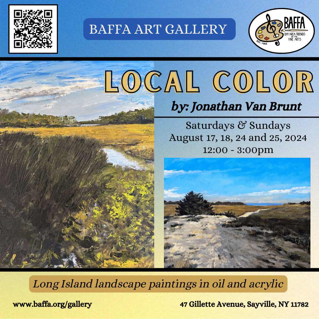 Local Color, Long Island landscape paintings in oil and acrylic by Jonathan Van Brunt will be the featured exhibit at the BAFFA Art Gallery in October. The exhibit can be viewed on Saturdays and Sundays August 17, 18, 24, and 25 from Noon to 3:00 PM. The BAFFA Gallery is at 47 Gillette Avenue in Sayville. For further information: www.baffa.org or (631)589-7343.