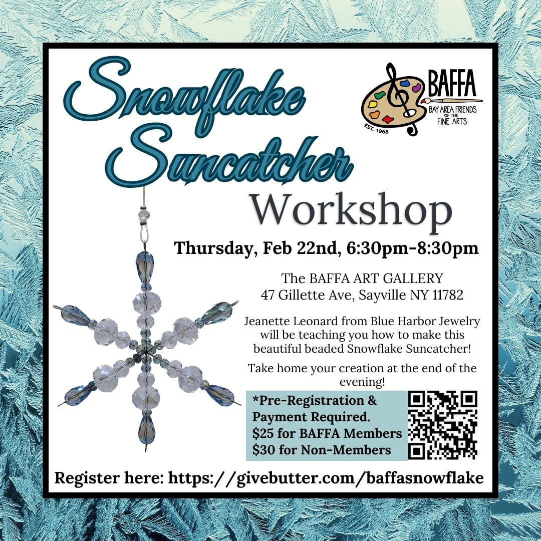 The BAFFA Art Gallery invites to join Jeanette Leonard, of Blue Harbor Jewelry, at a Snowflake Suncatcher Workshop at the Gallery on February 22, from 6:30 to 8:30 PM. Learn how to create a beautiful, beaded Snowflake Suncatcher. Take home your completed suncatcher at the end of the evening. The cost for the workshop is $25.00 for BAFFA members and $30.00 for non-members. Pre-registration and payment are required. Register at https://givebutter.com/baffasnowflake. The BAFFA Art Gallery is located in the Gillette House at 47 Gillette Avenue in Sayville.