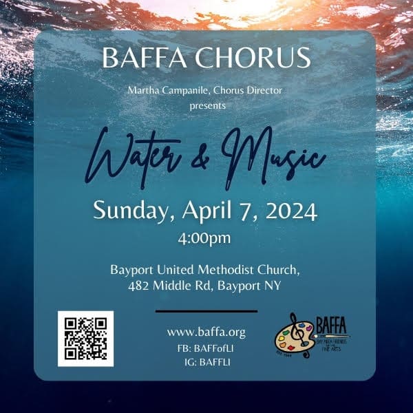 The Bay Area Chorus of BAFFA, under the direction of Martha Campanile, will perform at the Bayport United Methodist Church on April 7, at 4:00 PM. Water and Music is a concert that presents the way water is portrayed by different composers. Included in the concert are choral compositions by Eric Whitacre and Aaron Copland amongst others.