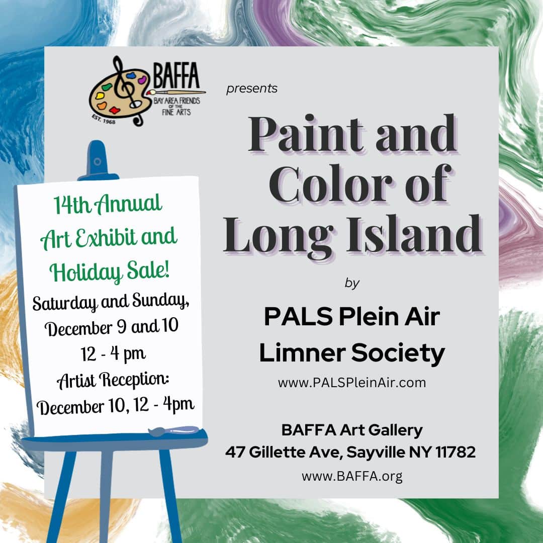 PALS Plein Air Limner Society presents Paint and Colors of Long Island, their 14 Annual Art Exhibit, at the BAFFA Art Gallery on December 9 and 10. The exhibit features paintings from local artists who have created their works in Plein Air, outdoors, on the spot, featuring the amazing beauty of Long Island. The exhibit can be viewed on both days from noon to 4 PM. The BAFFA Art Gallery is located in the Gillette House at 47 Gillette Avenue in Sayville. For further information about the exhibit, (631)589-7343, www.baffa.org, on Facebook at BAFFAofLI.