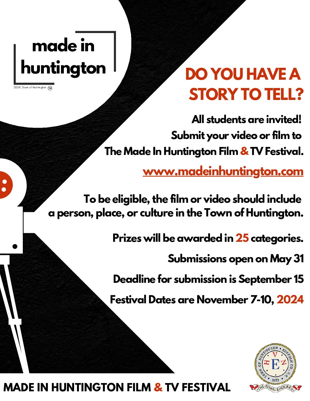 The Festival is open to film and TV professionals and amateurs a like who are invited to submit their video or film to The Made In Huntington Film & TV Festival. To be eligible, the film or video should include a person, place, or culture in the Town of Huntington. For more information go to www.madeinhuntington.com