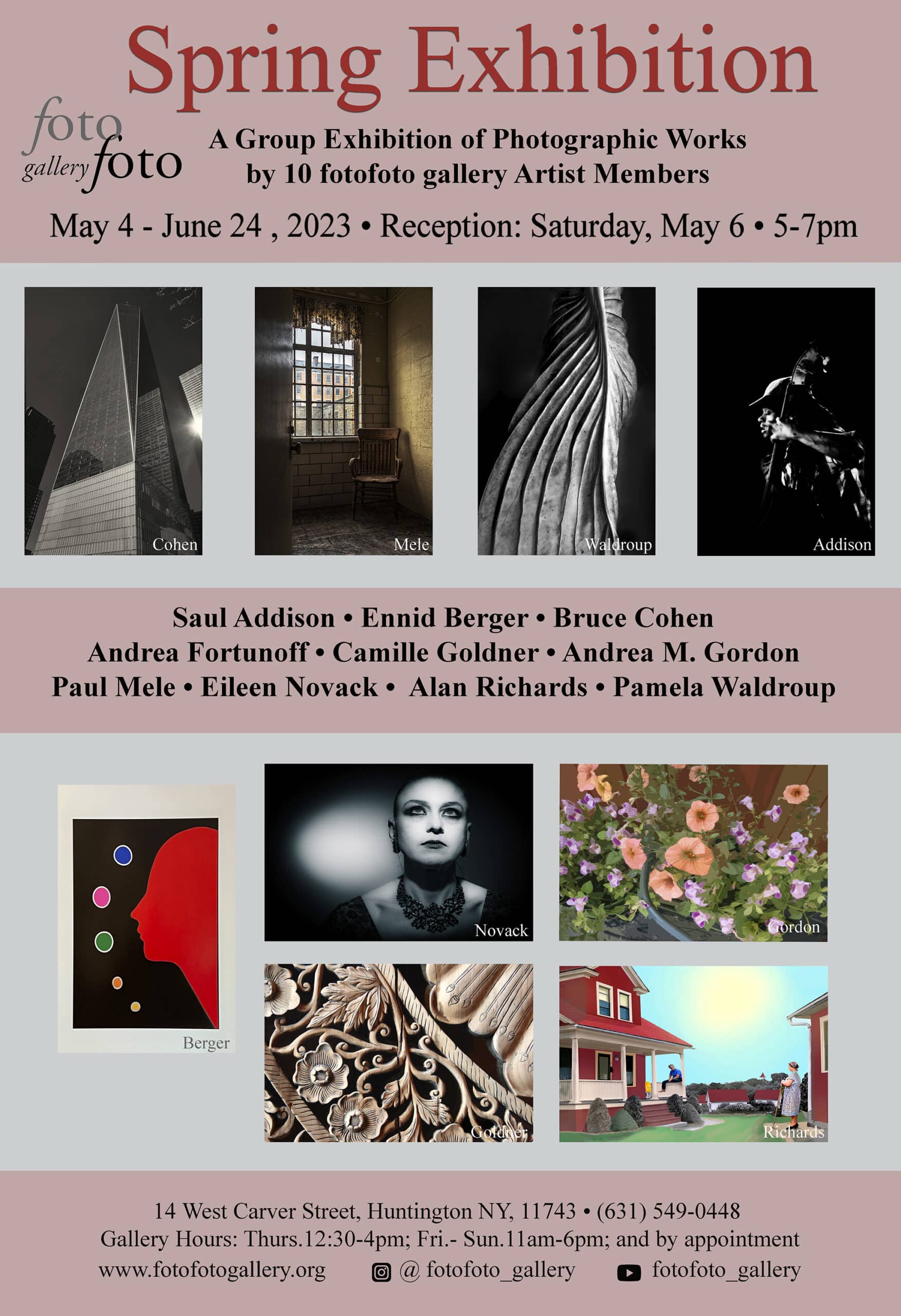 fotofoto Gallery is proud to present the “ARTIST MEMBERS’ SPRING EXHIBITION” ~ a group exhibition of photographic works by 10 fotofoto gallery photographers. Exhibit Dates: June 1 – 24. • OPEN HOUSE June 10th • Go to fotofoto Gallery Facebook, Instagram, and Website at fotofotogallery.org for more information.
