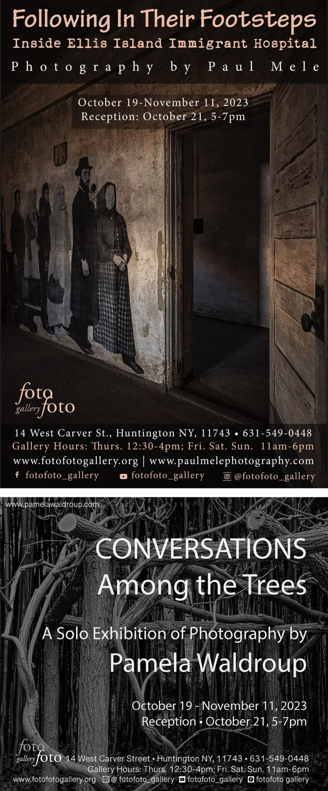 fotofoto gallery invites you to an ARTISTS’ RECEPTION for members, PAUL MELE and PAMELA WALDROUP, on Saturday, October 21 from 5-7pm. • 2 SOLO EXHIBITIONS of PHOTOGRAPHY: “Following in Their Footsteps – Inside Ellis Island Immigrant Hospital” by Paul Mele and “Conversations Among the Trees” by Pamela Waldroup. • Exhibit Dates: October 19 – November 11, 2023. Artist Talks Dates TBA.