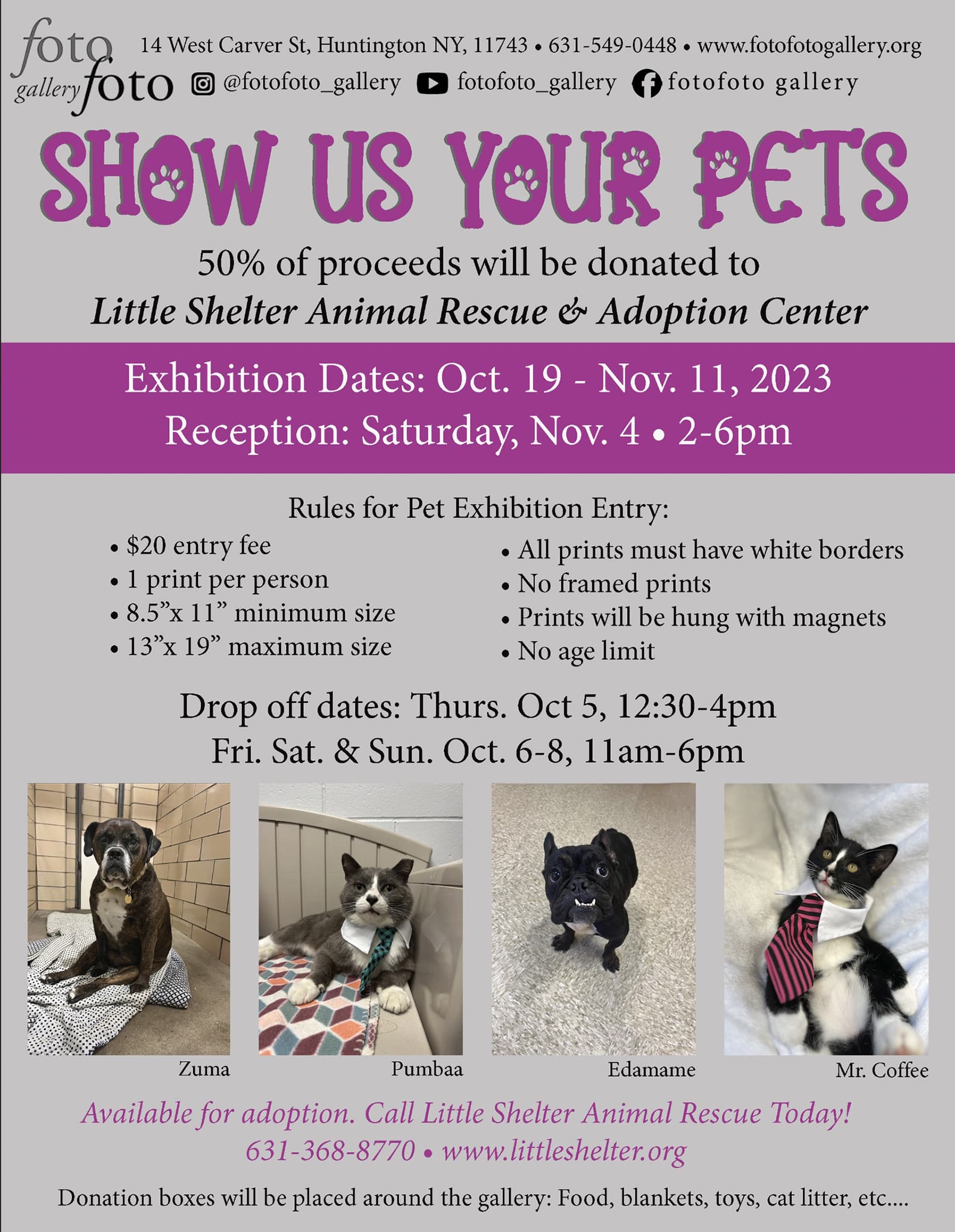 fotofoto gallery announces “SHOW US YOUR PETS!” ~ Photography Exhibition & 50/50 Fundraiser for The Little Shelter Animal Rescue & Adoption Center. Drop-Off Dates for Prints: Thursday, October 5, 12:30-4pm; Friday, Saturday and Sunday, October 6,7,8, 11am-6pm.