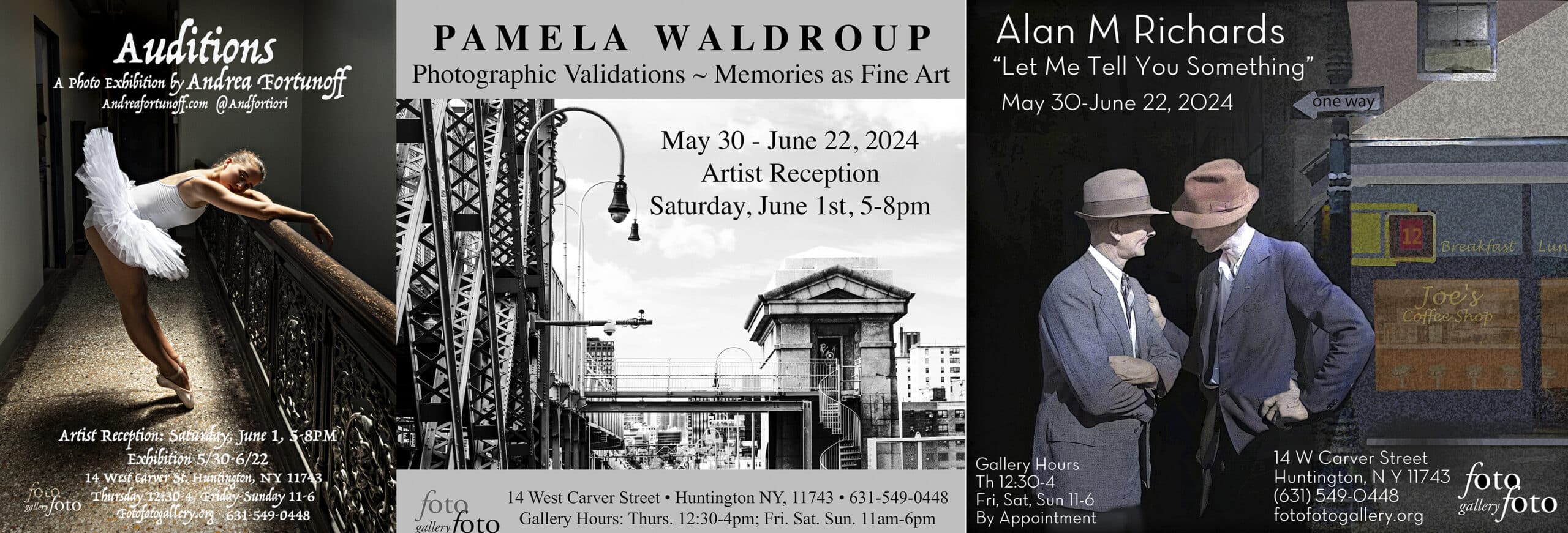 fotofoto gallery is proud to present 3 SOLO EXHIBITIONS of PHOTOGRAPHIC WORKS by fotofoto gallery Artist Members, ANDREA FORTUNOFF • ALAN M. RICHARDS • PAMELA WALDROUP. • Exhibit Dates: May 30, 2024 – June 22, 2024. • RECEPTIONS: Saturday, June 1, 5-8pm.