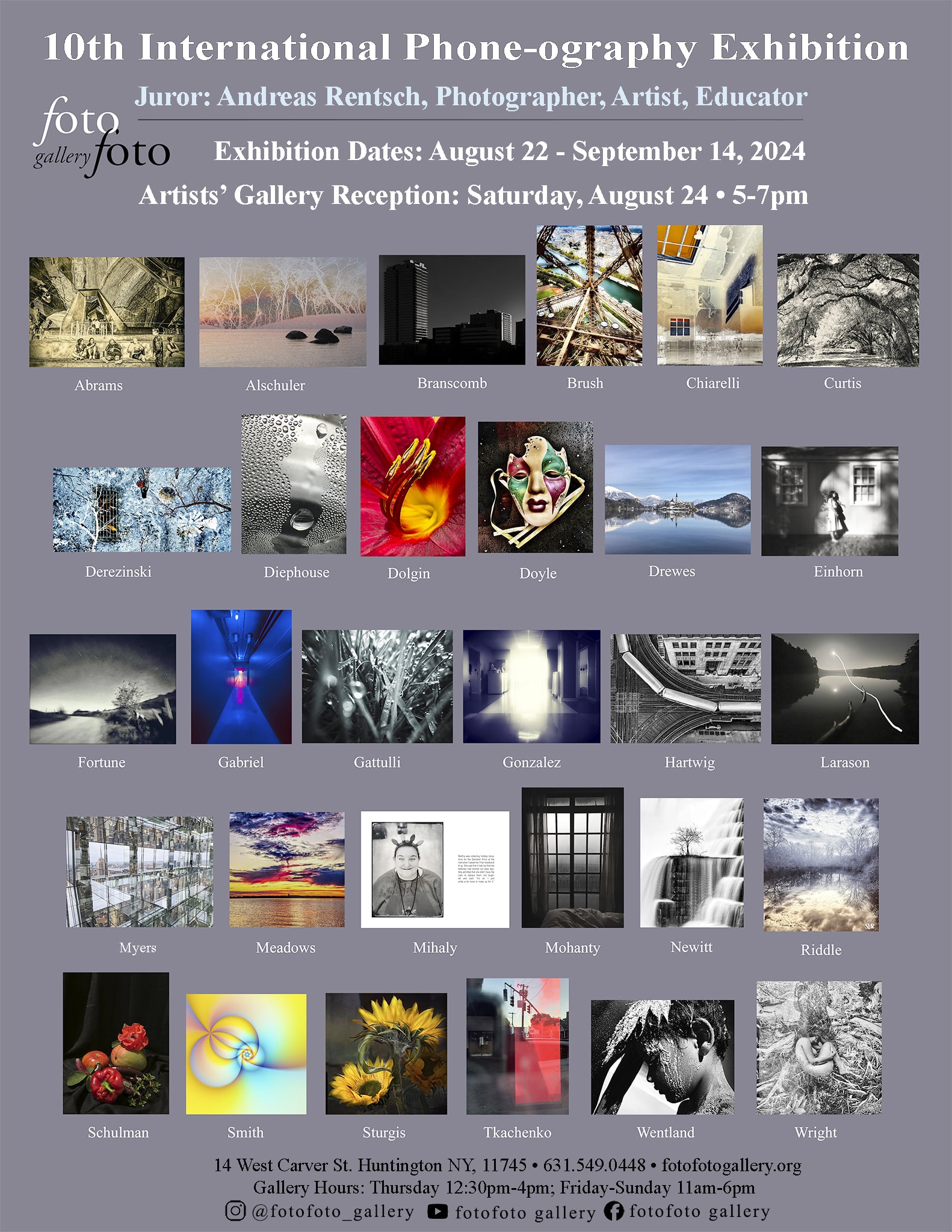 fotofoto gallery is excited to present the “10th International PHONE-OGRAPHY COMPETITION Exhibition.” Approximately 30 photographs, all created using a camera phone will be in a four-week exhibit at fotofoto gallery from Aug. 22 – Sept. 14. The juror, to be announced, will select 1st, 2nd and 3rd Place Winners. Go to fotofoto gallery Facebook, Instagram and Website for prospectus and additional information.