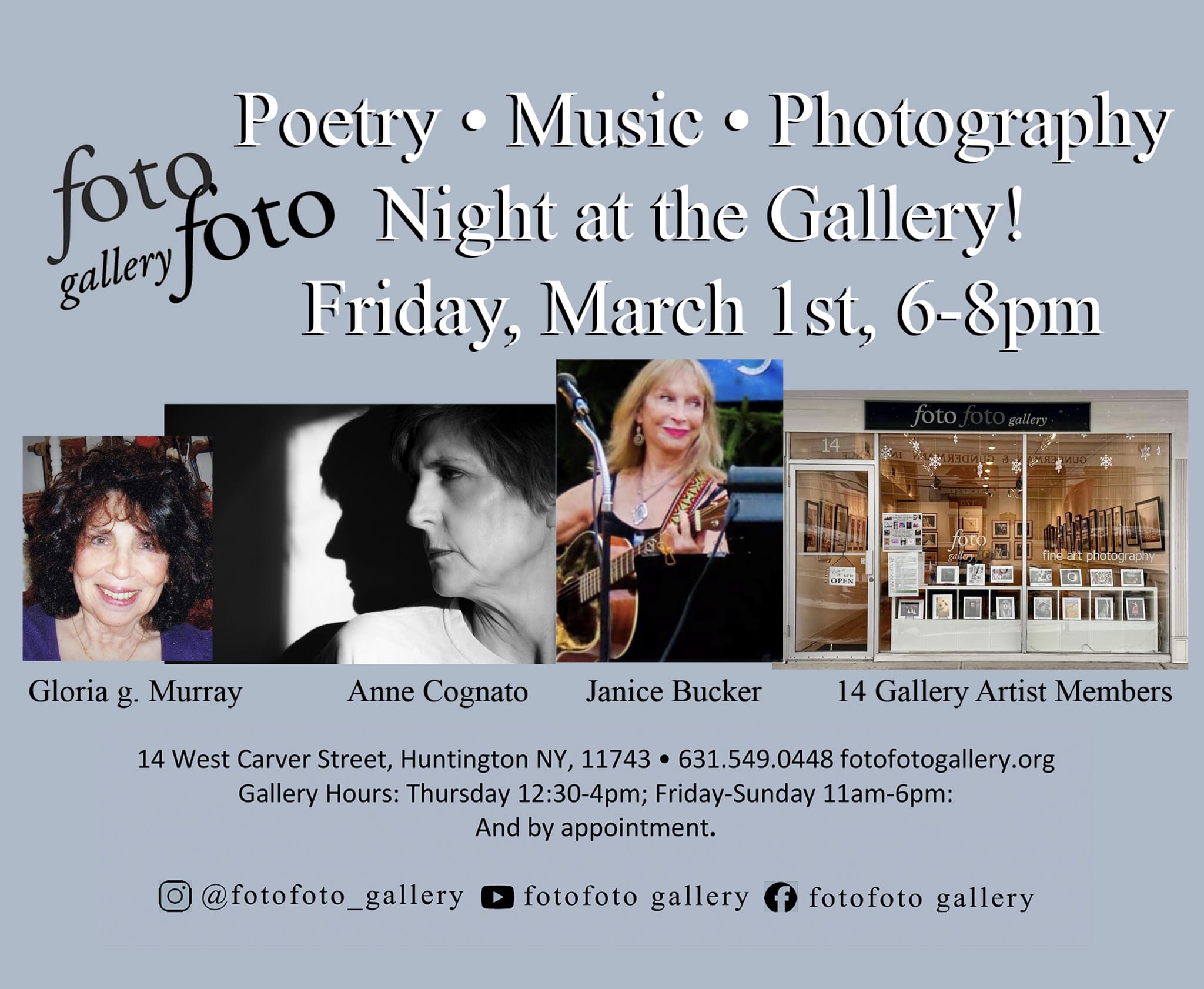 🔹 fotofoto gallery presents our first POETRY • MUSIC • PHOTOGRAPHY NIGHT featuring poets Anne Cognato, Gloria Murray, musician Janice Buckner and works by 14 fotofoto gallery Artist Members on Friday, March 1st from 6-8pm. Please join us for a wonderful evening full of words, songs and images that will soothe and inspire while you enjoy a few refreshments.