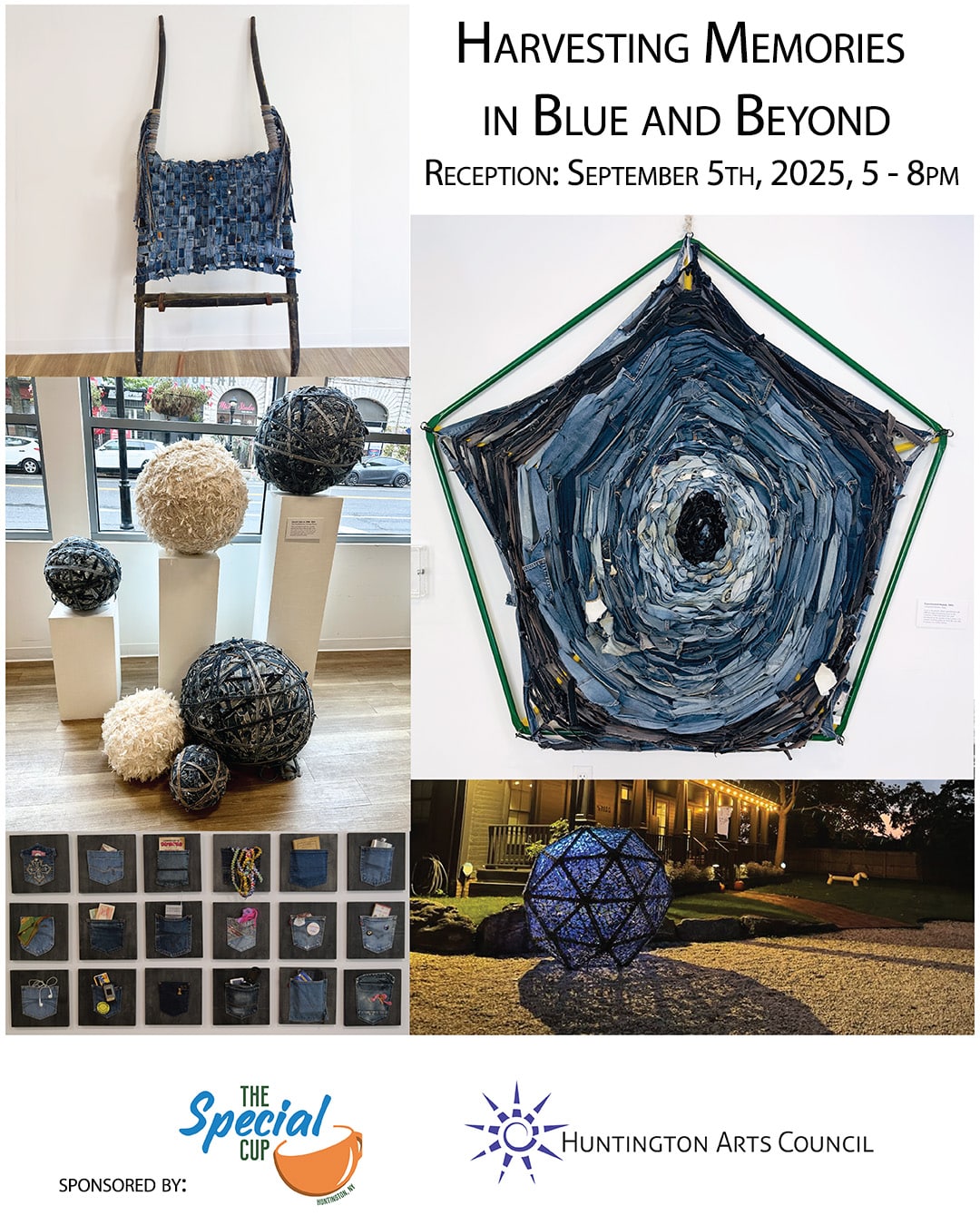 Harvesting Memories in Blue and Beyond, traces the development of Sherry’s recent large scale work Harvesting Memories in Blue. The exhibition presents an in-depth exploration of the creation, challenges, and impact of a 12-foot geodesic sphere created from over 1,000 pairs of upcycled denim jeans, installed in a farm field in Riverhead, NY. As an immersive, multimedia experience, Harvesting Memories in Blue and Beyond, uses photographs, video, related artwork, new pieces, and a panel discussion to explore the significance, environmental, and community dimensions of her work. This exhibition shares Sherry’s vision as a fiber artist, rooted in sustainability and collective storytelling, while honoring East End farmers and addressing textile waste.