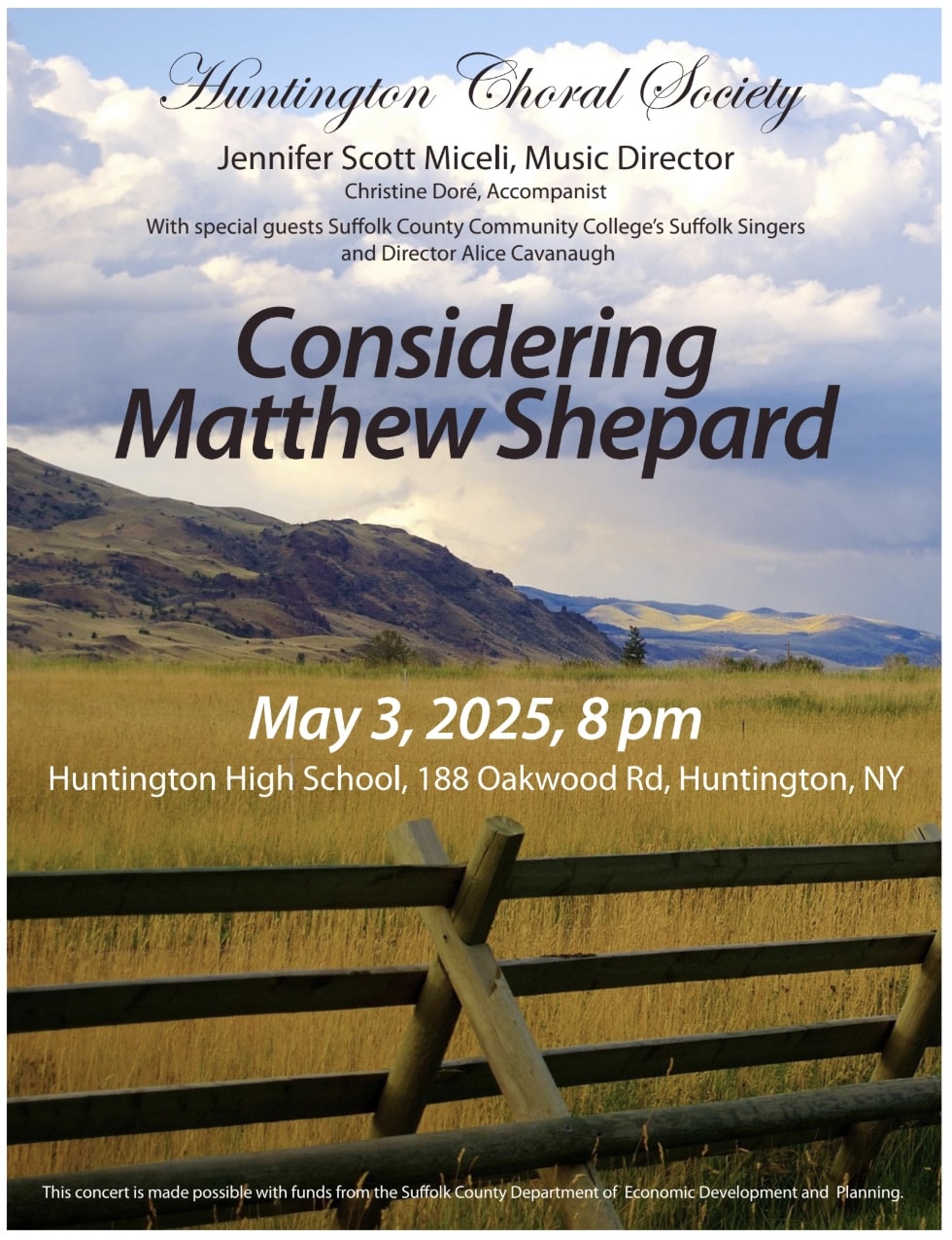 Join the Huntington Choral Society, under the direction of Dr. Jennifer Miceli, for a powerful performance of Considering Matthew Shepard, a moving fusion oratorio by Craig Hella Johnson that reflects on the life and legacy of Matthew Shepard. We are honored to be joined by special guests—the Suffolk Singers from Suffolk County Community College, led by Director Alice Cavanaugh. Don’t miss this evening of profound music and community reflection.