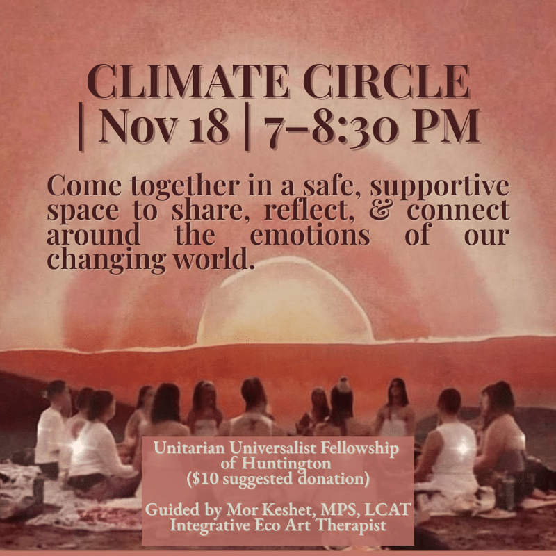 ​Come together in a safe, supportive space to share, reflect, & connect around the emotions of our changing world. Experience the Climate Emotions Mandala: a creative practice for grounding, expression, and community care. Guided by Mor Keshet, MPS, LCAT, Integrative Eco Art Therapist. Suggested $10 donation.