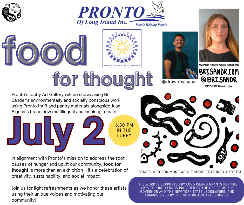 In alignment with Pronto’s mission to address the root causes of hunger and uplift our community, Food for Though is more than an exhibition – it’s a celebration of creativity, sustainability, and social impact. This work is supported by Long Island Grants for the Arts through funds provided by the Office of the Governor and The New York State Legislature and administered by The Huntington Arts Council.
