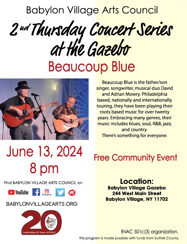 The Babylon Village Arts Council will presents its 2nd Thursday Concert Series featuring Beaucoup Blue on Thursday,June 13 at the Babylon Village Gazebo. Beaucoup Blue is the father/son singer, songwriter, musical duo David and Adrian Mowry. Philadelphia based, nationally and internationally touring, they have been playing their roots based music for over twenty years. Embracing many genres, their music includes blues, soul, R&B, jazz, and country. There’s something for everyone.