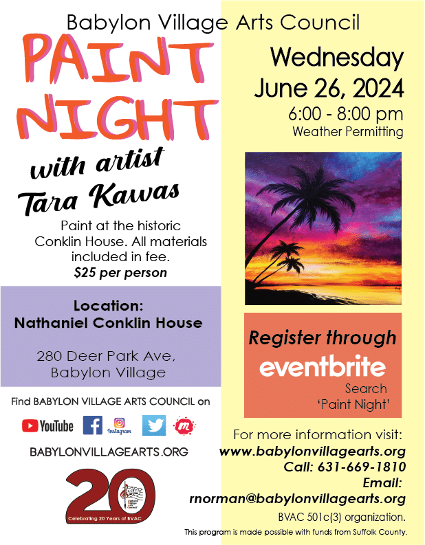 The Babylon Village Arts Council in partnership with the historic Nathaniel Conklin House and the Village of Babylon will present PAINT NIGHT with artist Tara Kawas on Wednesday, June26 from 6-8 pm. All materials are included in the fee of $25 per person. You may register through Eventbrite by searching ‘Paint Night”. It is a wonderful evening to spent time with friends on the Conklin House lawn.