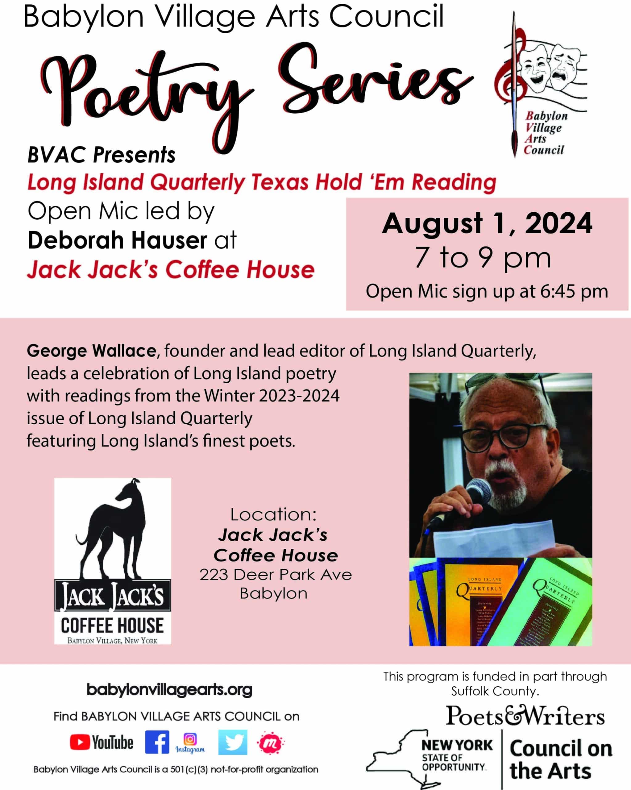 The Babylon Village Arts Council will present its Poetry Series on Thursday, August 1 featuring George Wallace. George Wallace, founder and lead editor of Long Island Quarterly, leads a celebration of Long Island poetry with readings from the Winter 2023-2024issue of Long Island Quarterly featuring Long Island’s finest poets. There will be an open mic led by Deborah Hauser.