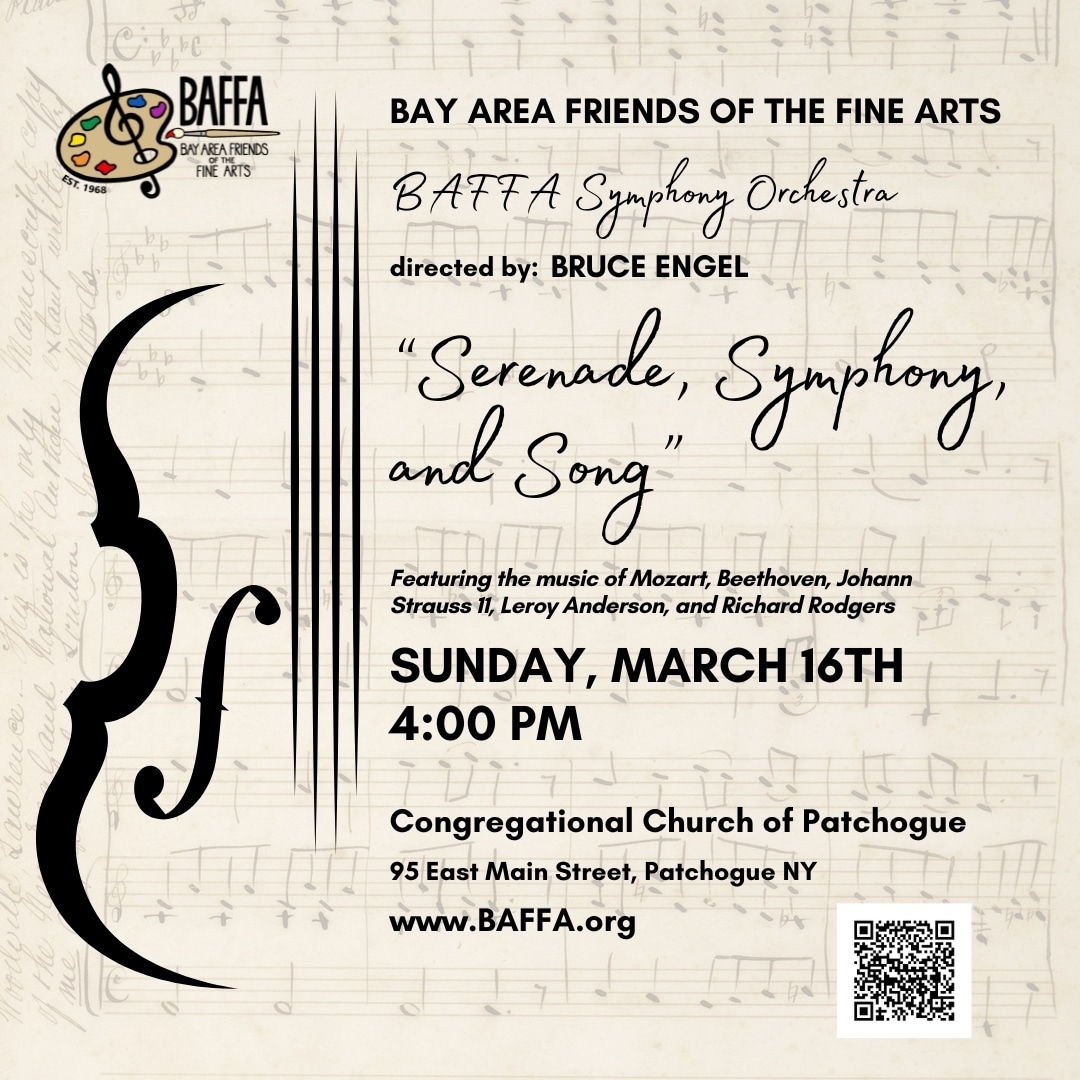 The BAFFA Symphony Orchestra presents Serenade, Symphony, and Song, at the Congregational Church of Patchogue on Sunday, March 16, 2025, at 4:00 PM. The concert will feature music by Mozart, Beethoven, and Strauss. The Church is located at 95 East Main Street in Patchogue. For further information: (631) 589-7343 or www.baffa.org.