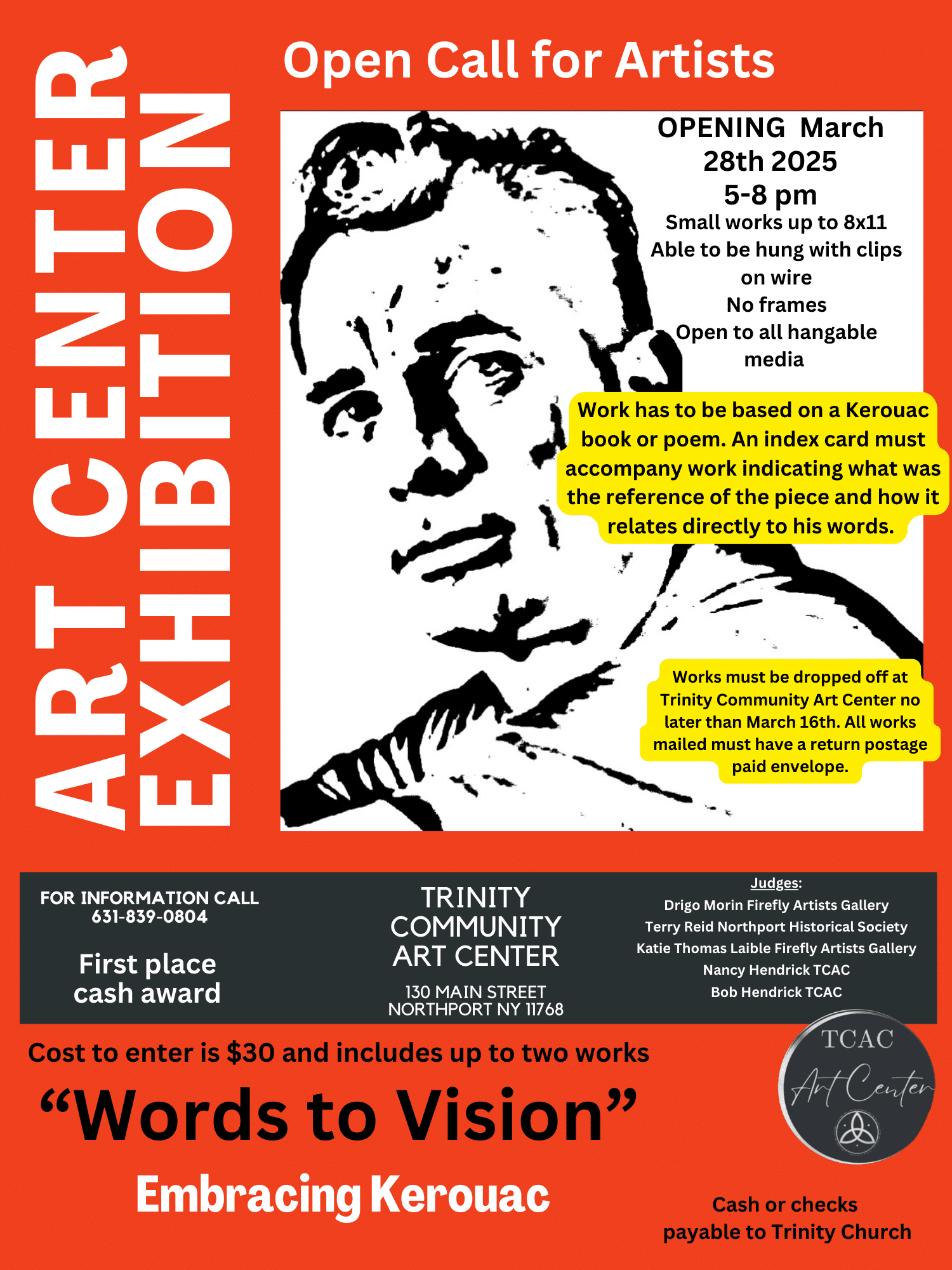 A small works open call for artists embracing the words of Jack Kerouac. The work that cannot exceed 8×10 and cannot be framed. It will be hung on wire. It is recommended to be created on canvas panel, paper, cardboard. Must embrace a part of a poem or book of Kerouac and an index card of what inspired you about specific Kerouac words must accompany piece. Updated delivery date will be the 23rd of March and to all HAC members a reduced participation fee of $20 for 2 pieces. We will have a judging panel of local gallery directors and the Northport historical society. It will be covered by the Northport Observer.
