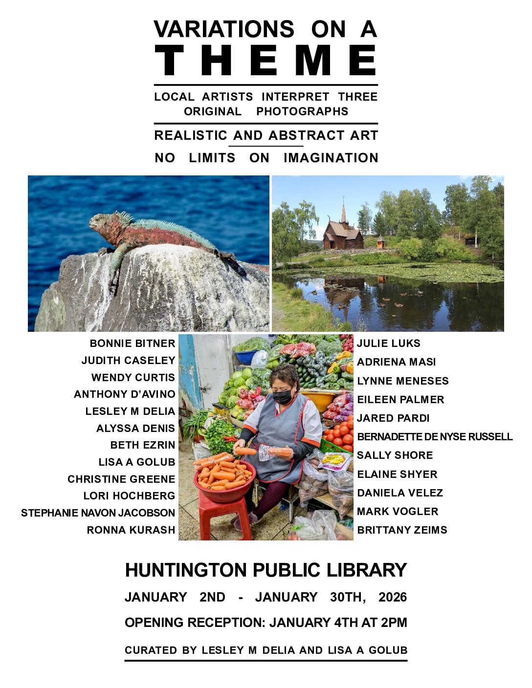 “Variations on a Theme” is a group show designed to bring awareness to the limitless range of artistic imagination. Twenty-four local artists who each work in different mediums and/or styles have interpreted one (or more) of three reference photos through their own lens and materials. The three photographs respectively represent a portrait of a vegetable vendor, a portrait of an iguana, and a landscape. The broad range of artist materials includes: watercolor, oil, acrylic and gouache paint, polymer clay, fabric collage, quilting, graphite, colored pencil , stained glass , mixed media, found object assemblage, ceramic sculpture , mosaic, tattoo art, pastel, encaustic, print, and digital art. The artists‘ submissions include both realistic and abstract interpretations of the reference photos.