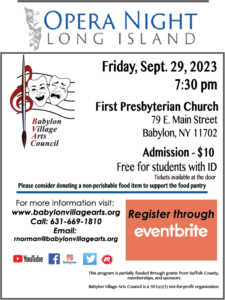 Babylon Village Arts Council will present Opera Night Long Island on Friday, September 29 at the First Presbyterian Church located […]