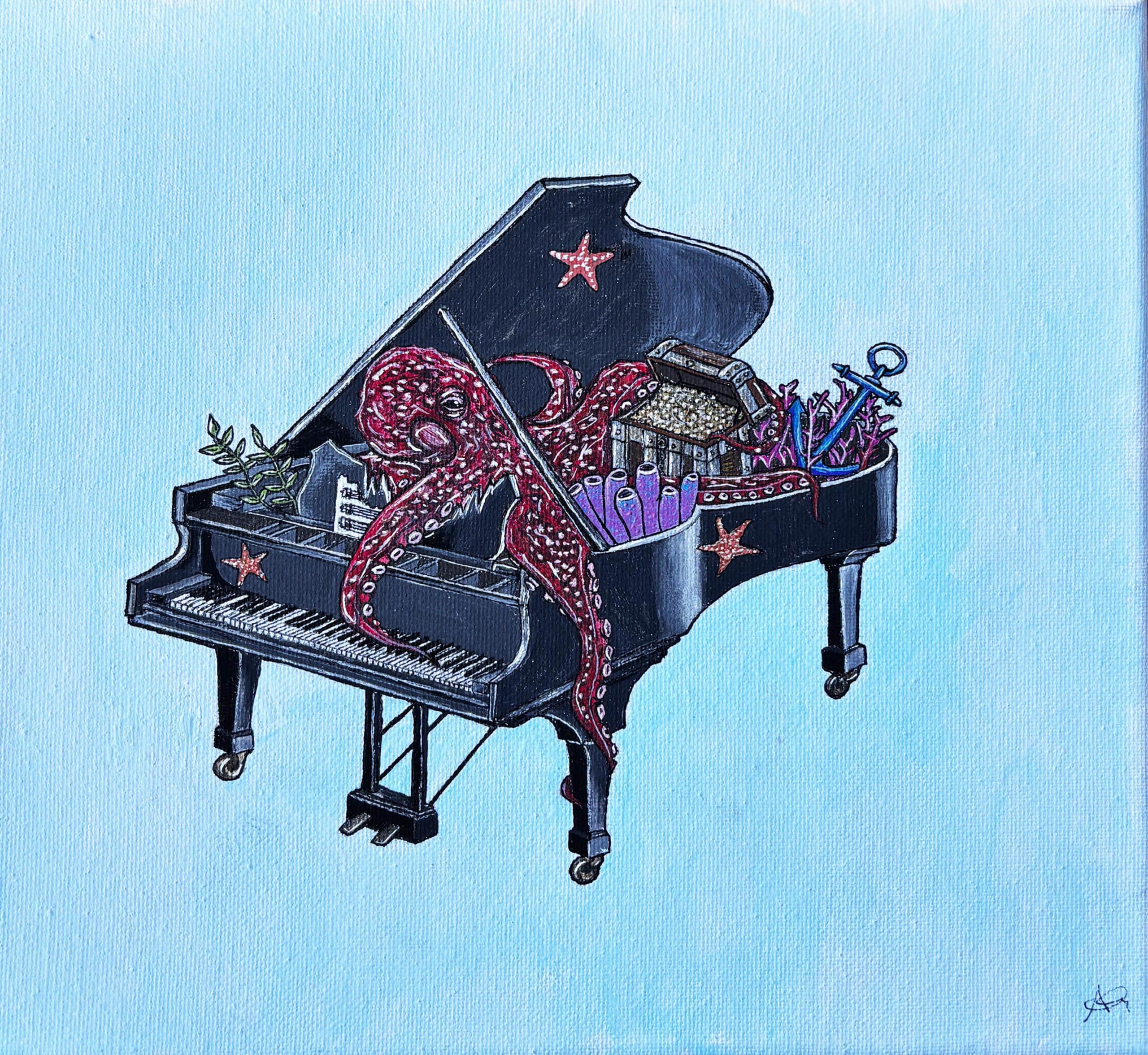 A selection of this year’s donated artwork. Clockwise, top left: Set the Table by Maria Misko, Handsome Heron by Gerry Hirschstein, Piano Man by Jeff Simon, Sunken Meadow inspired by Van Gogh by Joseph Wilkonski, Weaving with Cotton Thread by Galina Carroll, Klimt Meets Matisse by Anne Thompson, Symphony Under the Surface by Amy Goldfisher