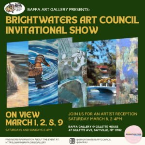 The BAFFA Gallery welcomes the Brightwaters Art Council Invitational Show for the first two weekends in March. Exhibit hours are […]